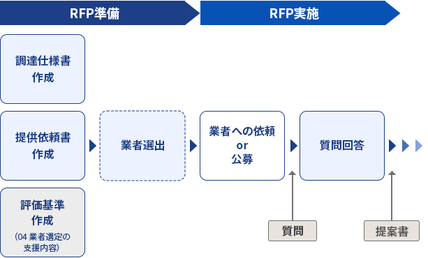 必要に応じて、システムベンダーへの情報提供依頼(RFI)の支援や、業者選定支援(評価基準作成、評価支援等)を実施します。