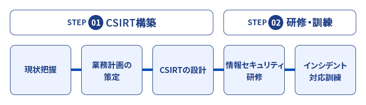 CSIRT体制をより効率的に構築していくため、Step1 CSIRT構築、Step2 研修・訓練の2ステップで進めていきます。