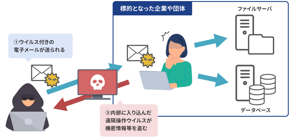 「標的型攻撃メール」とは、特定の組織を狙って、機密情報や知的財産・アカウント情報(ID、パスワード)などを窃取しようとする、インタネットメールを用いた攻撃手法です。