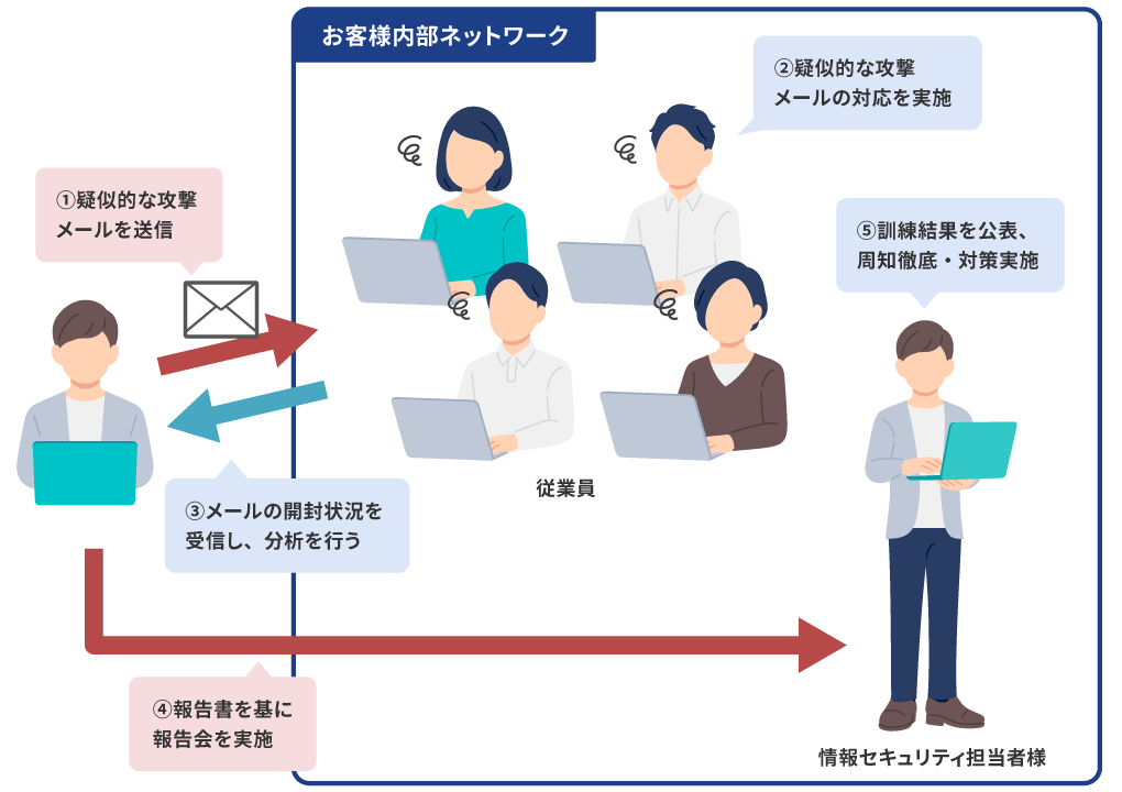 「標的型攻撃メール訓練」では、疑似的な攻撃メールを訓練対象者に送付し、セキュリティ意識の向上を図るとともに、標的型攻撃メールに対する現状の不足点の洗い出しを行います。また、訓練結果から、今後のセキュリティ対策を行う上での助言を行います。